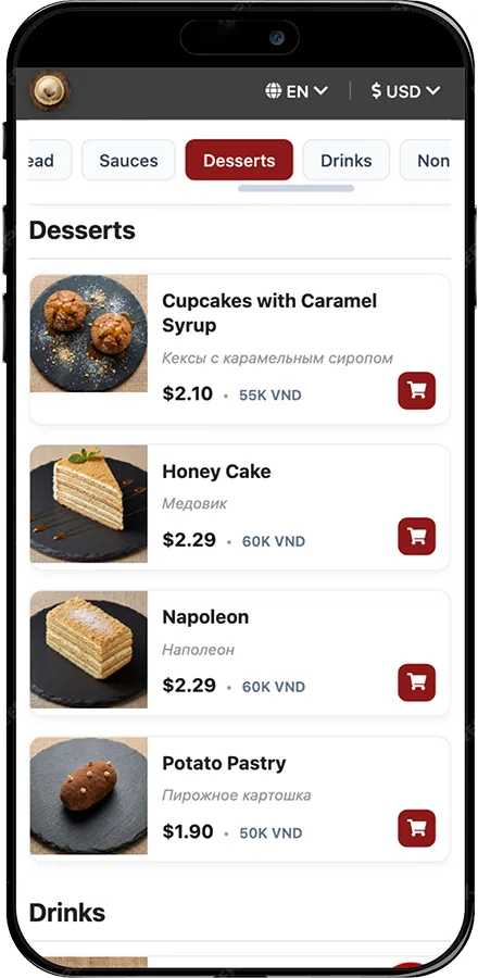 A website in 10 of the most popular tourist languages in your area — so guests can quickly learn about your restaurant, understand the menu, and place an order.